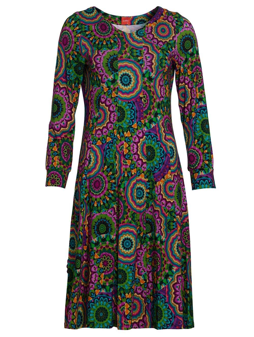 Det er en meget livlig og kunstnerisk kjole, som kunne passe godt til kreative eller boheme-inspirerede stilarter.