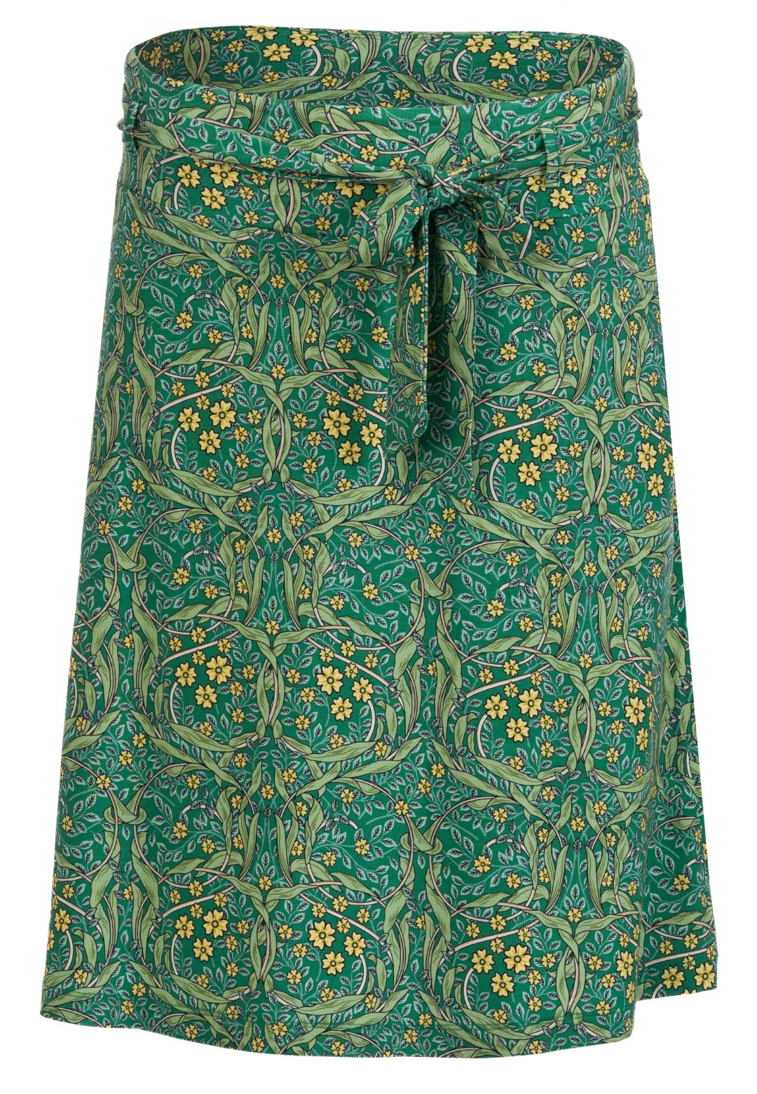 Denne nederdel har et smukt og detaljeret botanisk mønster i grønne nuancer med gule blomster. Designet er inspireret af klassiske, naturinspirerede mønstre og giver et elegant, men samtidig afslappet look.